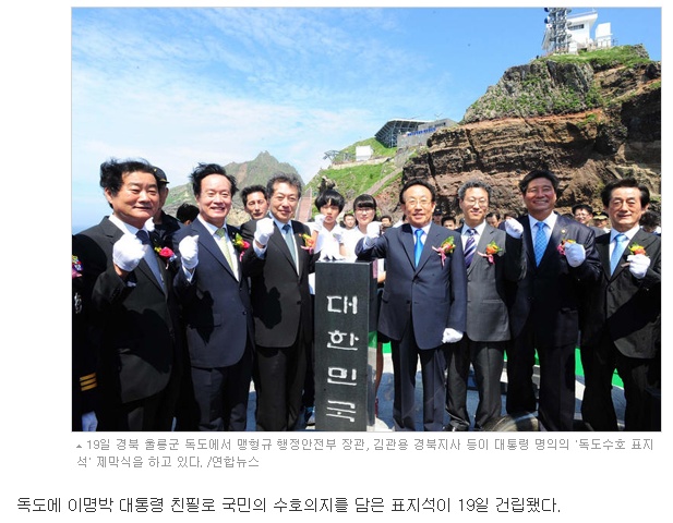 그런데 그것도 항상 임기응변식이니 삑사리 나는 게 한두 번이 아닙니다. 그러다 보니 국민들은 명박 상 취임 때부터 지금까지 맨날 오해만 하는 어처구니없는 입장을 벗어나지 못하고. 월요일 조중동 기사감 주느라 이명박 똘마니들이 독도에 가서 사진 속 비석을 세웠나 봅니다.