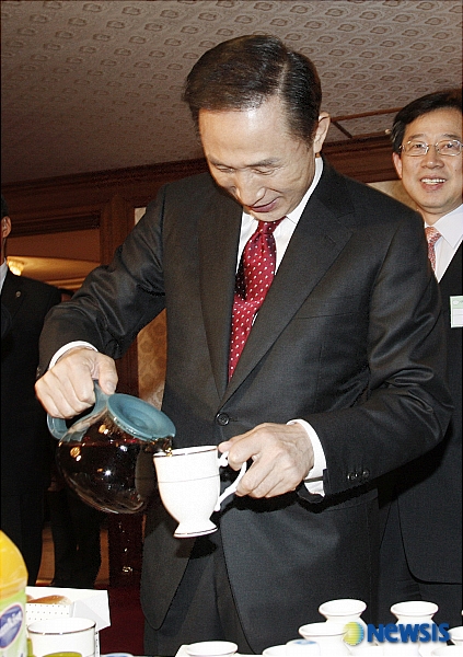 이명박 대통령이 10일 오전 경기 과천 정부종합청사에서 열린 기획재정부 업무보고 시작 전 직접 커피를 따르고 있다. (사진=청와대 제공)/남강호기자 ka****@newsis.com