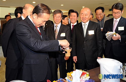 취임후 광주를 첫 방문한 이명박 대통령이 21일 광주과학기술원 행정동 회의실에서 열린 환경부 업무보고에 앞서 직접 커피를 타고 있다. /광주·전남사진기자단
